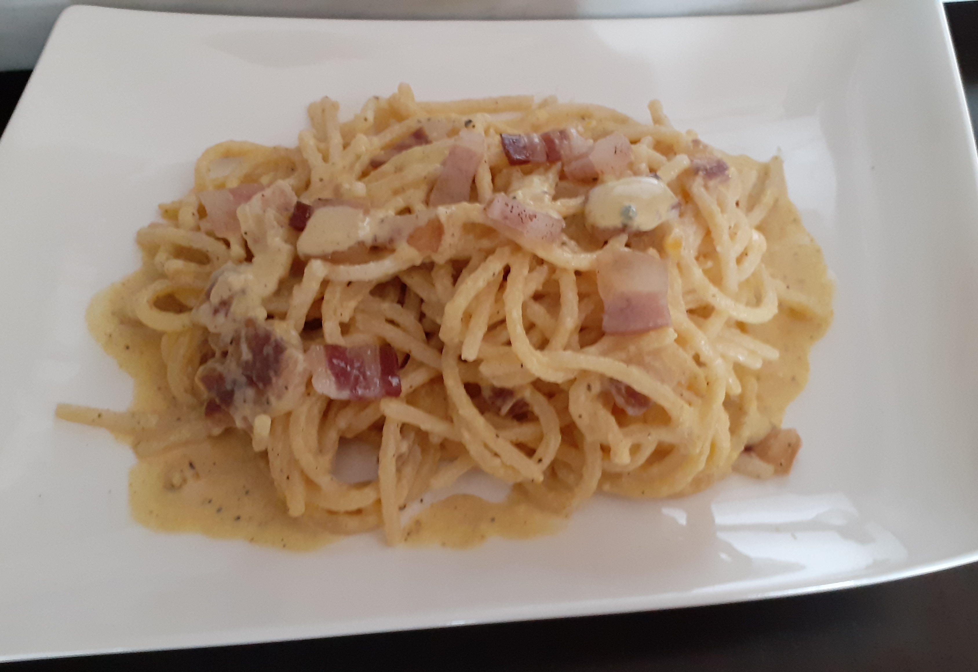 Scolare la pasta, saltarla nella padella con metà del guanciale e, fuori dal fuoco aggiungere metà della crema di formaggi e uova frullata, impiattare e guarnire i piatti con il resto del guanciale e la crema di rimasta.